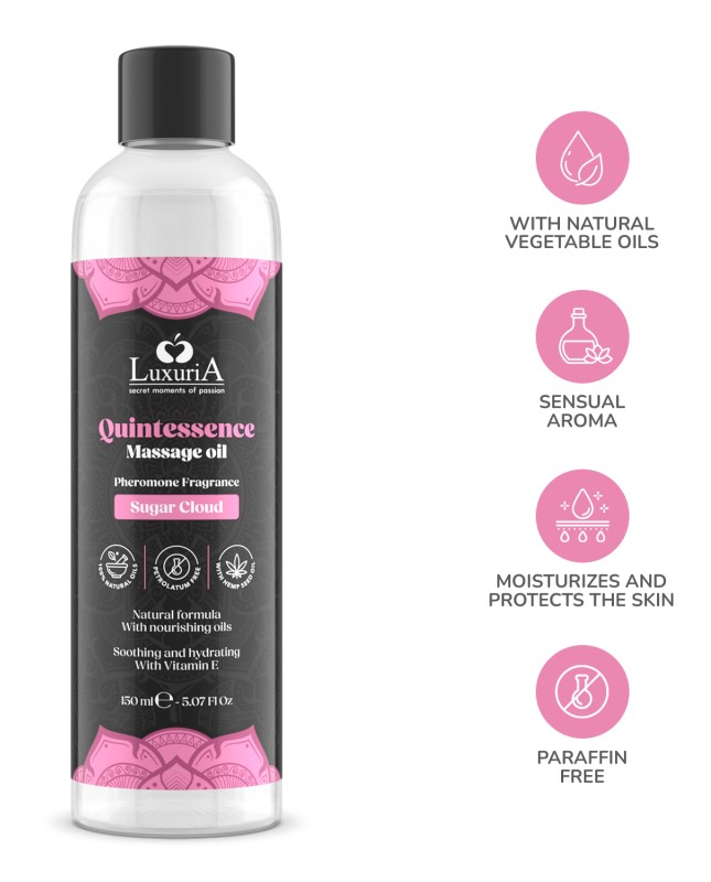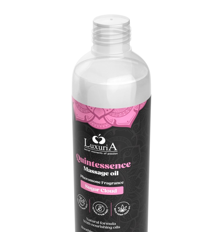 Quintessence ulje za masažu, Sugar Cloud je rafinisano prirodno ulje za masažu obogaćeno ekskluzivnim formulacijama zasnovanim na dragocenim uljima i pažljivo odabranim stimulativnim esencijama. Njegova hranljiva formula, napravljena od 100% prirodnih biljnih ulja, kombinovana sa senzualnim aromama, pruža intenzivnu hidrataciju, ostavljajući kožu mekom i mirisnom. Bez parafina, ovo ulje za masažu će poštovati i štititi vašu kožu, zahvaljujući prisustvu ulja semena konoplje, dok će stimulisati vaša čula prijatnim notama čokolade koje će vas pratiti tokom cele masaže, vodeći vas ka zadovoljstvu. Ulje je formulisano bez dodavanja agresivnih sastojaka za kožu. Sastav je zasnovan isključivo na najkvalitetnijim prirodnim sastojcima koji poštuju dobrobit tela. Ulje obezbeđuje maksimalnu kompatibilnost čak i sa najosetljivijom kožom, ostavljajući je mekom i svilenkastom nakon svake upotrebe. Takođe se može koristiti kao ulje za kupanje kako bi koža bila hidrirana i mirisna. Ne sadrži parafin i boje, što vam omogućava da u potpunosti uživate u svakom trenutku zadovoljstva u potpunoj bezbednosti. Njegova formula je dizajnirana da nežno klizi po vašoj koži, čuvajući je bezbednom i bez nelagodnosti, u svakom trenutku.