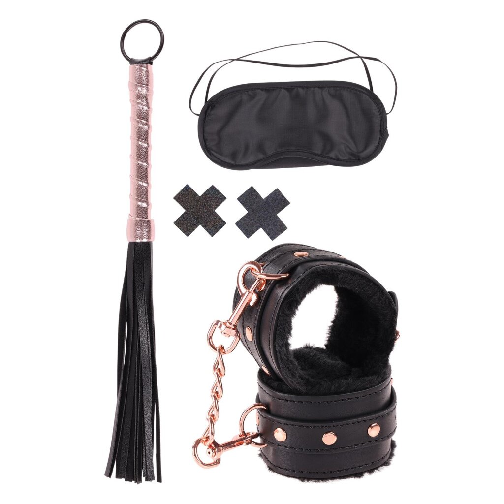 Komplet uključuje pojaseve za zglobove, pastile za jednokratnu upotrebu, povez za oči i mini pojaseve za bičevanje.
