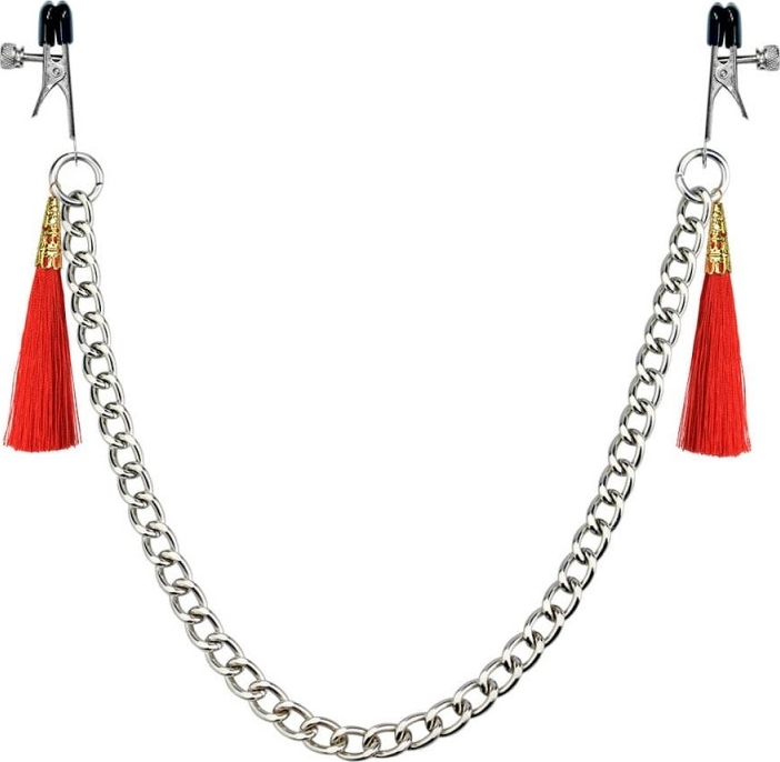 Štipaljke za bradavice sa lancem i crvenom kićankom. Na ovim štipaljkama za bradavice možete da podesite koliko jako želite da vas štipaljka stegne.