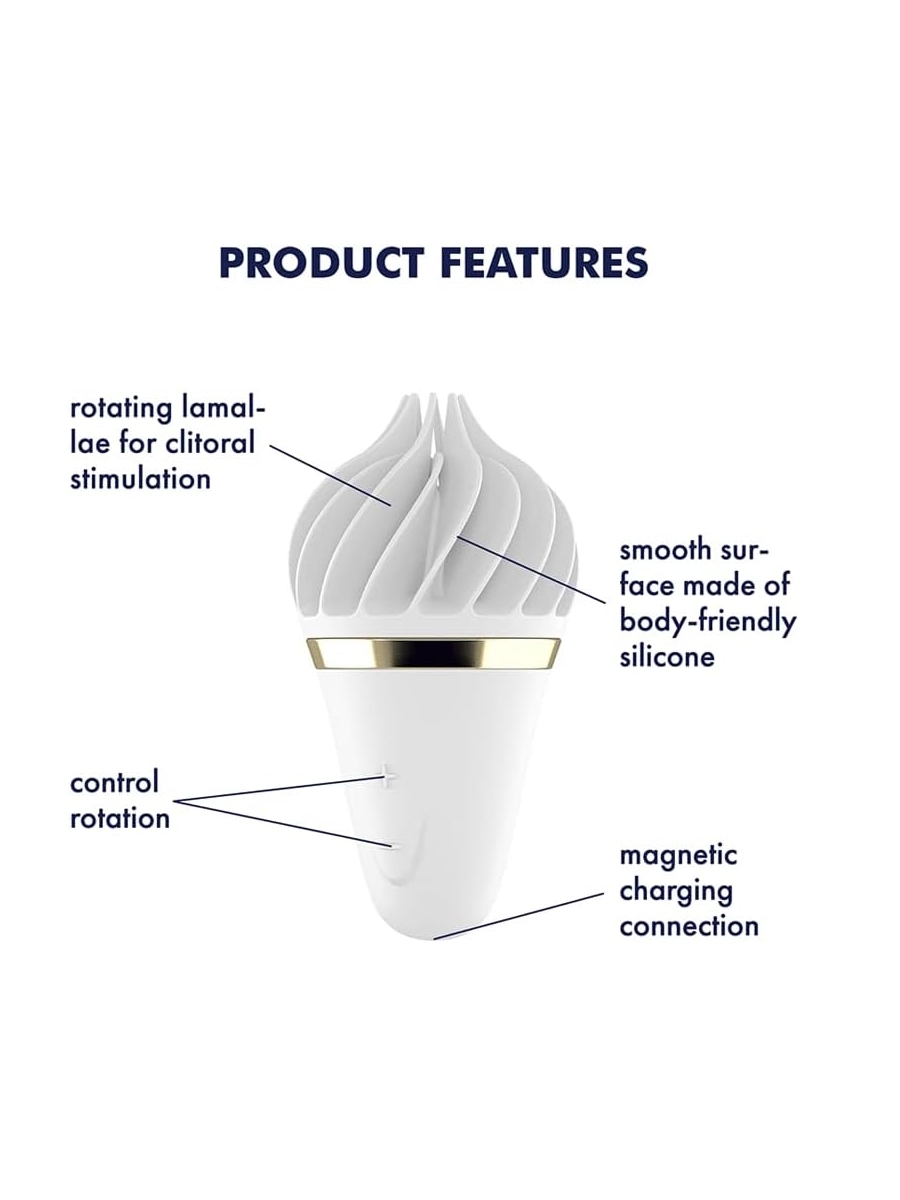 Uživajte u sladoledu i zimi i leti. Najnoviji model klitorističnog stimulatora sa vibracijom poznatog svetskog brenda u obliku sladoleda. Napravljen je u prelepom dizajnu koji će svakoga ostaviti bez daha. Ima 15 različitih režima vibracije. Vodootporan je i može se koristiti pod tušem ili kadom. Napravljen je od visokokvalitetnog glatkog silikona i izuzetno se lako čisti. Dugačak je 10,4 cm i prečnika 5,6 cm. Ima svoj punjač.