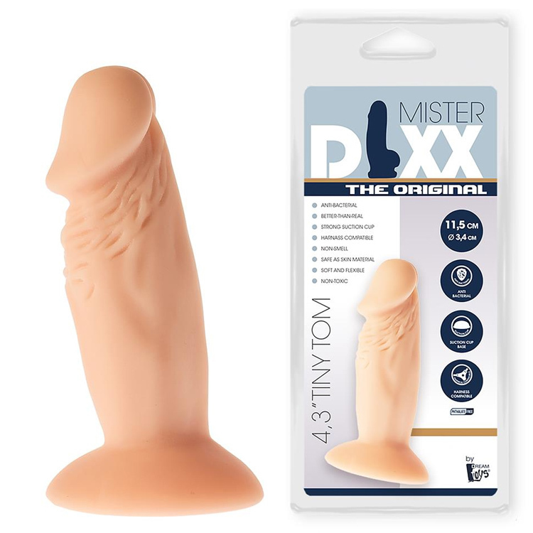 Igračka za zadovoljstvo iz mašte Mr Dixx Original serije. Ovaj mekani, fleksibilni dildo Tiny Tom od 4,3 inča pruža realističan osećaj mekoće na koži. Napravljen od antibakterijskog PVC-a, ova seks igračka je bez mirisa i bezbedna za telo. Jaka vakuumska čašica u osnovi vam omogućava da uživate u zadovoljstvu bez upotrebe ruku kada je pričvršćena za bilo koju glatku, ravnu površinu ili O-prsten pojasa. Dildoi Mister Dixx sa pravim osećajem ne sadrže lateks, tako da možete igrati sa sigurnošću. Tiny Tom je skromne veličine, što ga čini pogodnim za početnike ili one koji preferiraju sitnije objekte za zadovoljstvo. Dimenzije: dužina 11,5 cm, širina 3,4 cm.