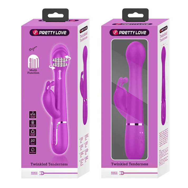 Ljubičasti Dejon vibrator, sa dodatkom za klitoris u obliku zeca, rotirajući i potiskujući 3 u 1, iz kolekcije Twinkled Tenderness kompanije Pretty Love, je inovativni uređaj za zadovoljstvo dizajniran da podigne vaše intimne trenutke na nove visine. Ovaj elegantni i svestrani trostruki stimulator ima dizajn sa dvostrukim dejstvom za ciljanu stimulaciju G-tačke i klitorisa, nudeći uživanje. Napravljen od vrhunskih materijala bezbednih za telo, višefunkcionalni zec pruža baršunasto glatku teksturu na vašoj koži, dodajući dašak luksuza vašim seansama zadovoljstva. Istražite 7 moćnih režima vibracije, 4 rotacije i 4 funkcije potiska sa svojim intuitivnim kontrolama, omogućavajući vam da prilagodite svoje senzualno putovanje. Ukupna dužina vibratora je 22.6cm, a prečnik iznosi 3.7cm. Penetrirajući deo ima dužinu od 14cm. Preporučujemo upotrebu lubrikanta na vodenoj bazi.