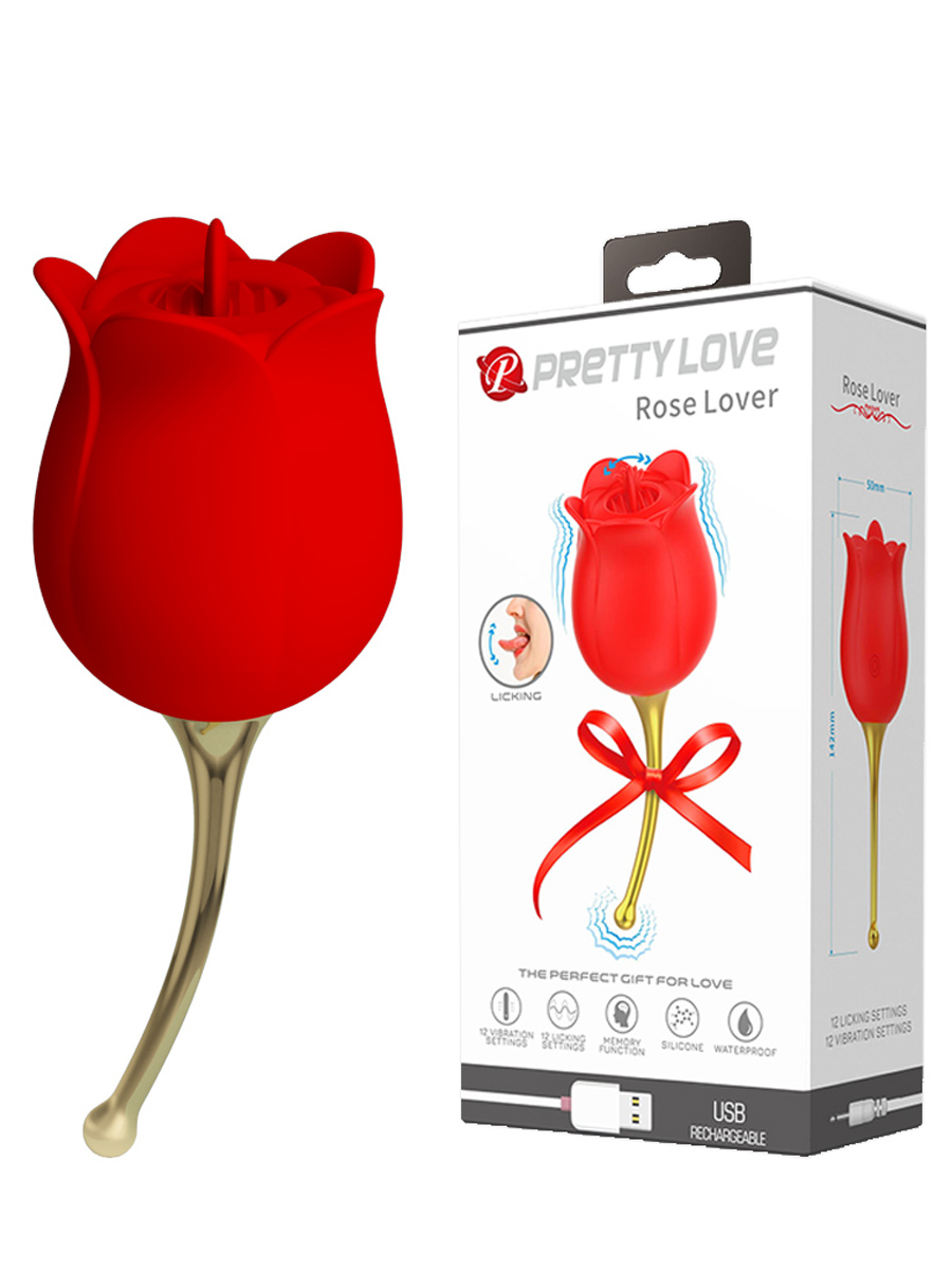 Vibrator Pretty Love Rose Lover je ženski intimni proizvod koji stimuliše klitoralnu regiju, koji vas  dovodi do višestrukih do orgazama. Masažer je oblikovan kao realistična ruža, zgodan je za nošenje na putovanja. Crvene latice ruže vam omogućavaju da doživite vrhunsko zadovoljstvo oralnog seksa u bilo kom trenutku, što doprinosi da se postigne orgazam za kratko vreme. Pritisnite i držite dugme za napajanje 2 sekunda, da biste ga uključili, crveno svetlo se upali, ponovo pritisnite dugme za napajanje i možete se prepustiti. Ruža vibrator poseduje 12 jakih frekvencija i vibracije. Materijal je potpuno bezbedan i udoban za korišćenje.Uz Ružu vibrator, dobija se USB kabl, za punjenje. Preporučujemo upotrebu lubrikanta na vodenoj bazi.