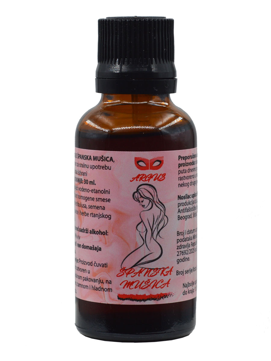 Ako želite da probate nešto novo i da pospešite Vaš seksualni odnos probajte ovaj naš novi proizvod na prirodnoj bazi sa akcentom na probranim potpuno prirodnim sastojcima.Španska mušica je dodatak ishrani na bazi ekstrakta homogene smese herbe tribulusa,semena piskavice i herbe rtnjaskog čaja.piskavica povećava tonus,poboljšava opšte stanje i smanjuje slabost organizma.Tribulus pomaže zdravlje polnih organa i hormonsku aktivnost,povećava seksualnu želju i sposobnost.