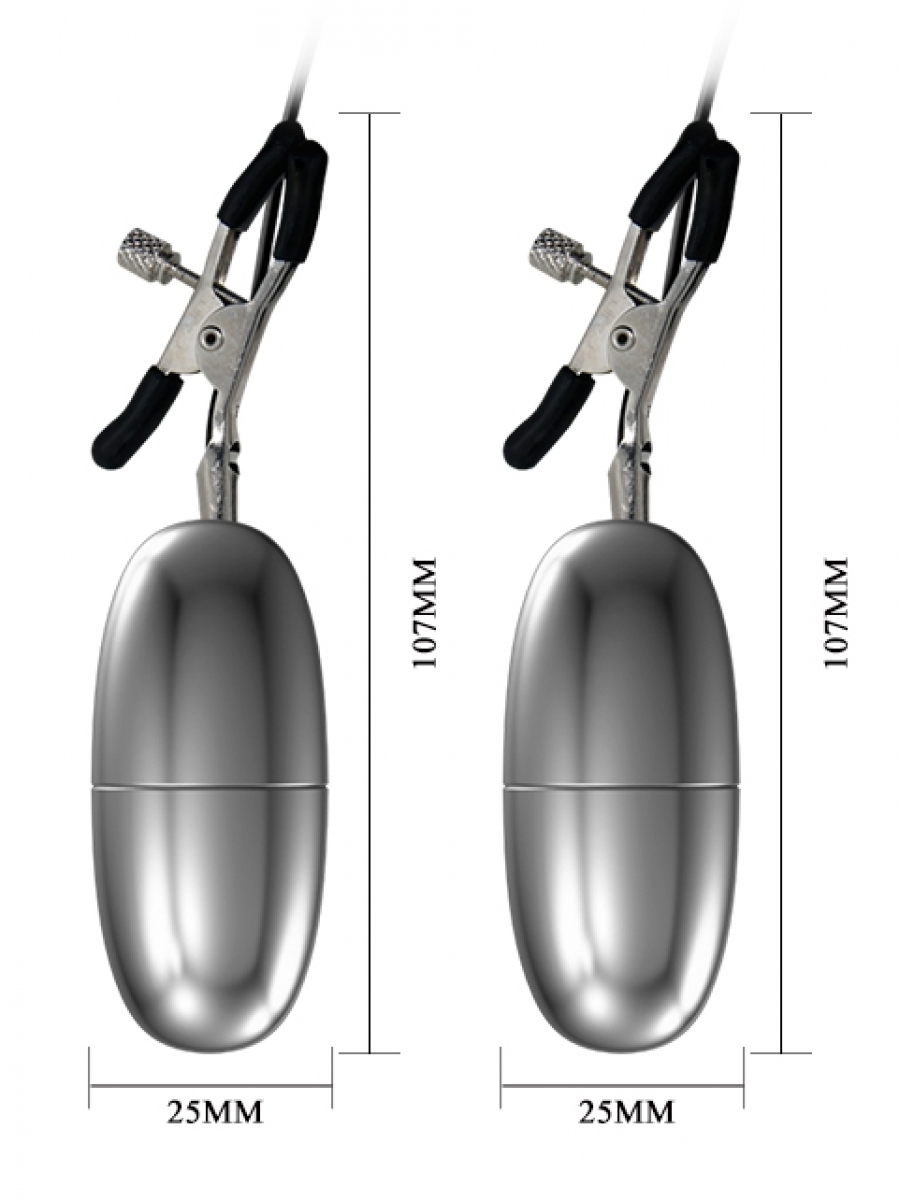 Štipaljke za bradavice sa vibro metkovima sa žičnim daljinskim , koji omogućava korigovanje intenziteta vibracije. Ova sjajna igračka ispuniće sve vaše želje i potrebe. Izuzetno laka i prijatna igračka za stimulaciju bradavica. Na samim štipaljkama ima i točkić za podešavanje jačine stezanja. Lako se održavaju samo toplom vodom i sapunicom , a baterije koje su potrebne su 2 AA.
